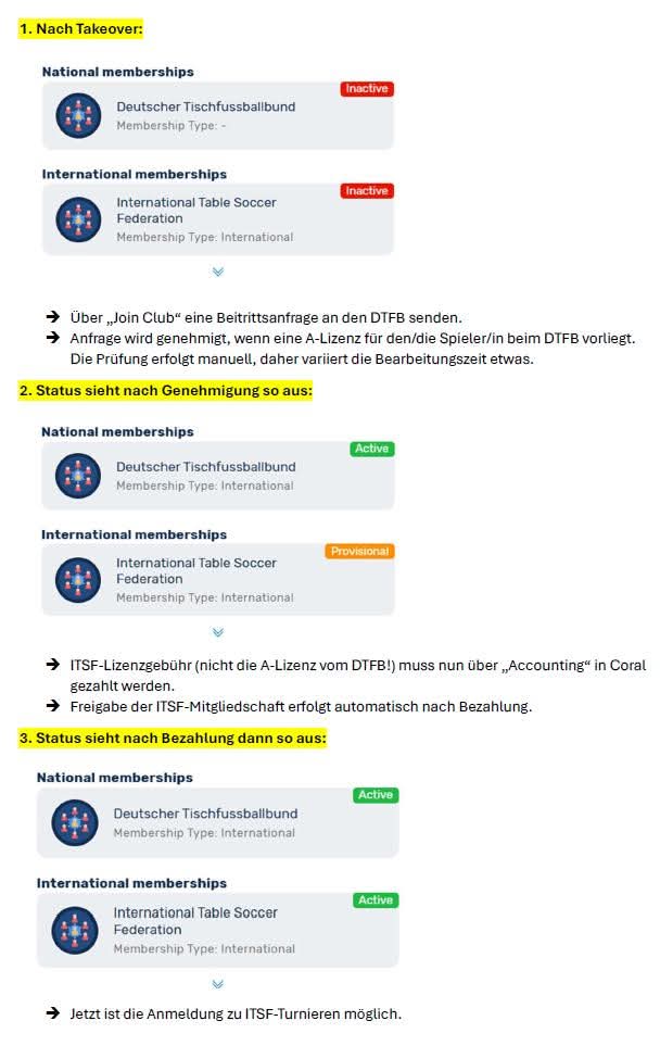 Für die Teilnahme an ITSF‑Turnieren ist eine eigenständige Registrierung über Coral erforderlich. Voraussetzung für die Anmeldung über Coral ist eine aktive Mitgliedschaft (Status „Active“, grün markiert) sowohl beim Deutschen Tischfußballbund als auch bei der International Table Soccer Federation. Die Aktivierung der Mitgliedschaften (Join Club DTFB) muss jedes Jahr erneut erfolgen, da vor der Freischaltung das Vorhandensein einer gültigen A‑Lizenz überprüft wird. Der ITSF erhebt zudem eine Jahres-Lizenzgebühr, die über Coral zu zahlen ist. Diese Gebühr ist auch im Jahr 2026 unabhängig von der A-Lizenz des DTFB.