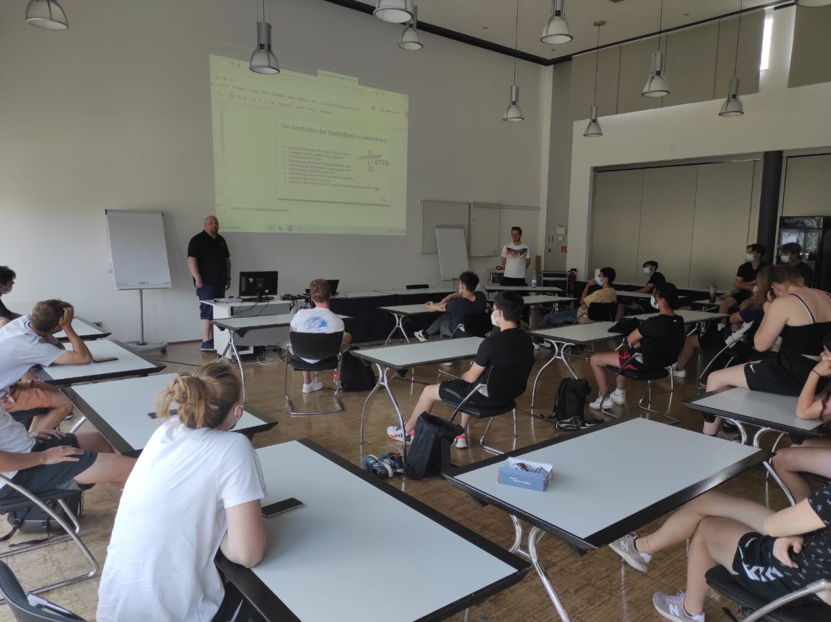 In einer Theorieeinheit mit diversen Videosequenzen hörten 35 Teilnehmer:innen gespannt zu, wie Karsten Kuckhoff (Turnierdirektor des DTFB) und Thomas Haas (Einzel-Weltmeister 2017) die Bedeutung von Kickern für unsere heutige Gesellschaft erklärten, die weit über ein "Freizeitspiel" hinausgeht.