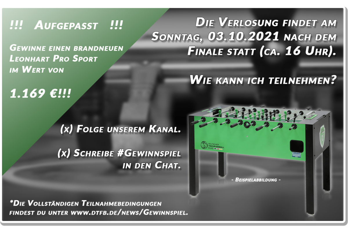 - Als Preis für die Teilnahme erhält der Gewinner eine Tischfußballtisch des Typs Leonhart Sport in einer Farbe seiner Wahl.